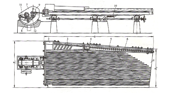云錫搖床結(jié)構(gòu)圖 1-床面; 2-給礦斗; 3-給礦槽; 4-給水斗; 5-給水槽; 6-菱形活瓣; 7-滾輪; 8-機(jī)座; 9-機(jī)罩; 10-彈簧; 11-搖動(dòng)支臂; 12-曲拐杠桿