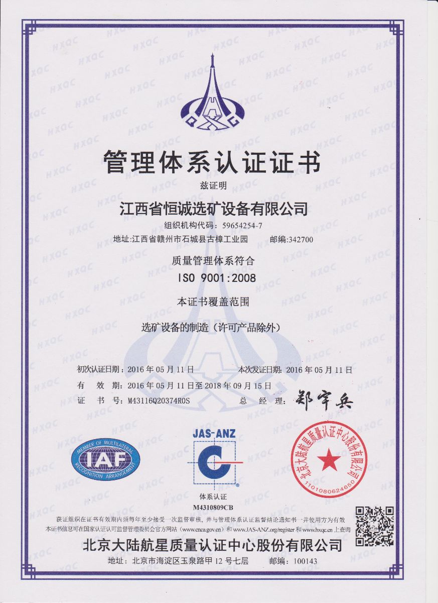 經(jīng)過北京大陸航星質(zhì)量認(rèn)證中心股份有限公司BEIJING DALU HANGXING QUALITY CERTIFICATION CENTER CO.,LTD.的嚴(yán)格審核,公司榮獲國家認(rèn)監(jiān)委認(rèn)可ISO9001:2008質(zhì)量管理體系認(rèn)證證書